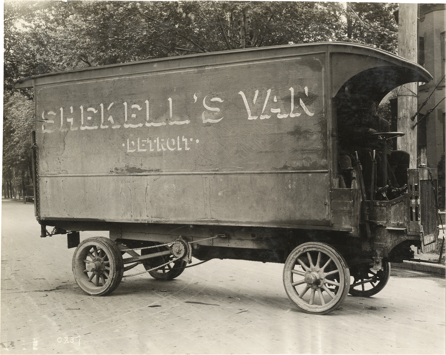 Driver in 1910 Reliance truck, Shekell's Moving Van Company