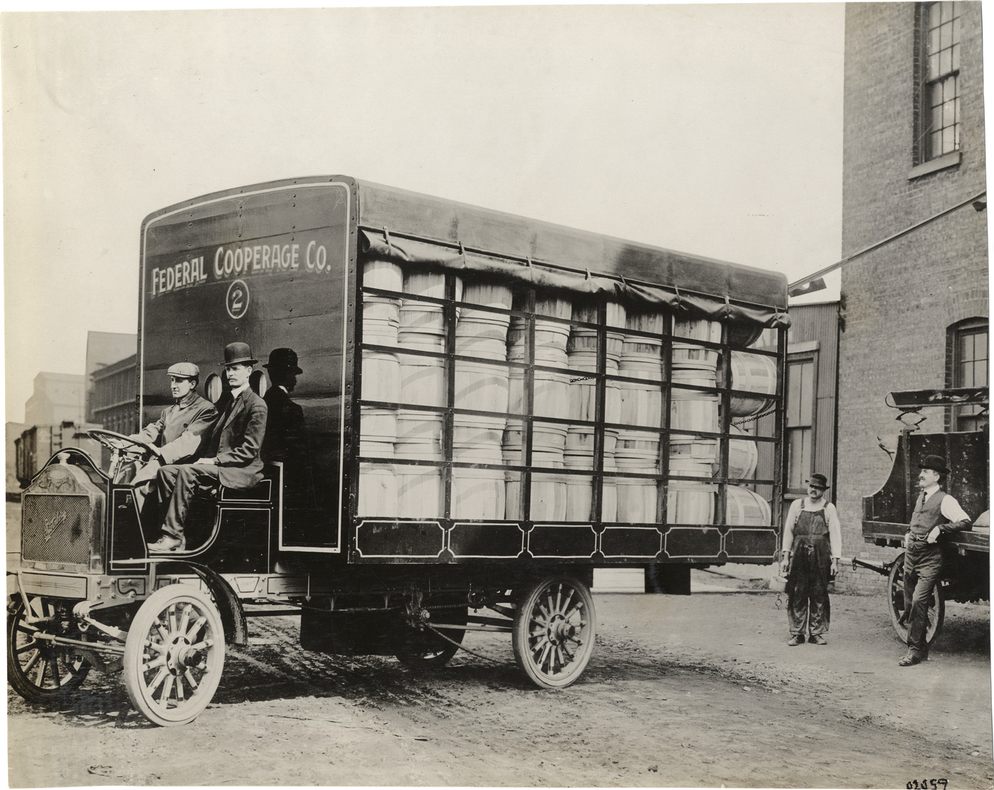 Driver and passenger in 1911 Sternberg truck, Federal Cooperage Company