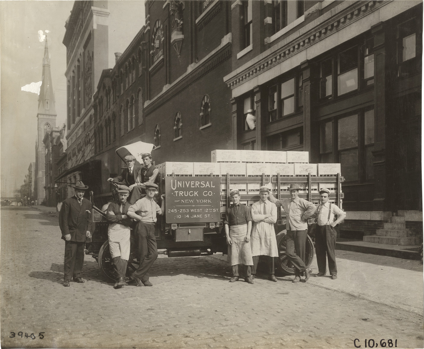 View of men posing with 1912 Universal truck; truck carries crates of Peter Doelger lager beer. Sign on truck: "Universal Truck Co. of New York, 245-253 West 12th St., 10-14 Jane St." Stamped on back: "Spooner & Wells, Inc., photographers, telephones 3472-3473 Columbus, 1931 Broadway, New York." Handwritten on back: "Motor trucks--Universal, 1912."