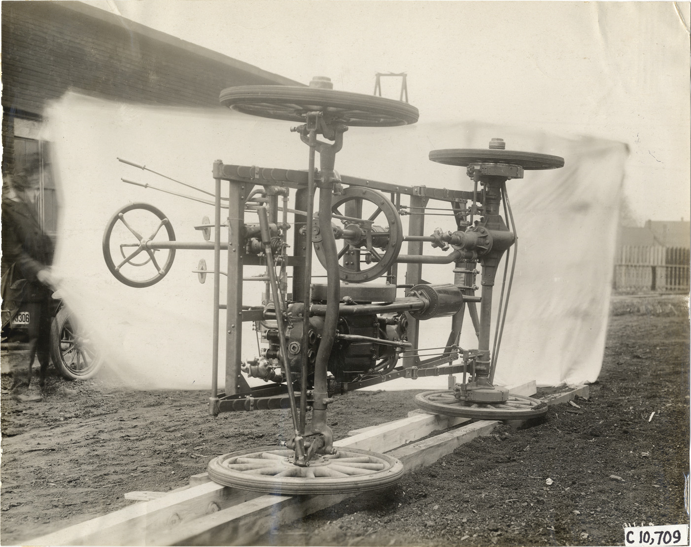 View of chassis for 1910 Van Dyke truck, turned on its side. Handwritten on back: "Motor trucks--Van Dyke, 1910."