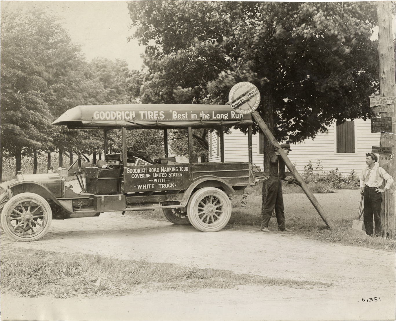 1911 White truck parked on roadside next to workers installing Goodrich tires road sign