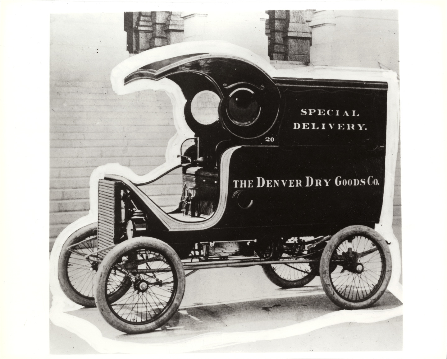View of 1900 White Steamer truck owned by the Denver Dry Goods Company. "The Denver Dry Goods Co., special delivery" painted on side of truck. Handwritten on back: "Motor trucks--White. The first White steamer truck. One of the first two White trucks, a light steamer, was built in 1900 and delivered to the Denver Dry Goods Co. in 1901."