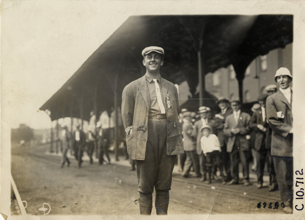 View of unidentified man wearing suit with pins on lapel, probably a racing official, during 1911 Federation of American Motorcyclists races in Fort Erie, Ontario. Spectators and grandstand in background. Stamped on back: "Spooner & Wells, Inc., photographers, telephones 3472-3473 Columbus, 1931 Broadway, New York." Handwritten on back: "Motorcycle races--Federation of American Motorcyclists championship races, 1911."