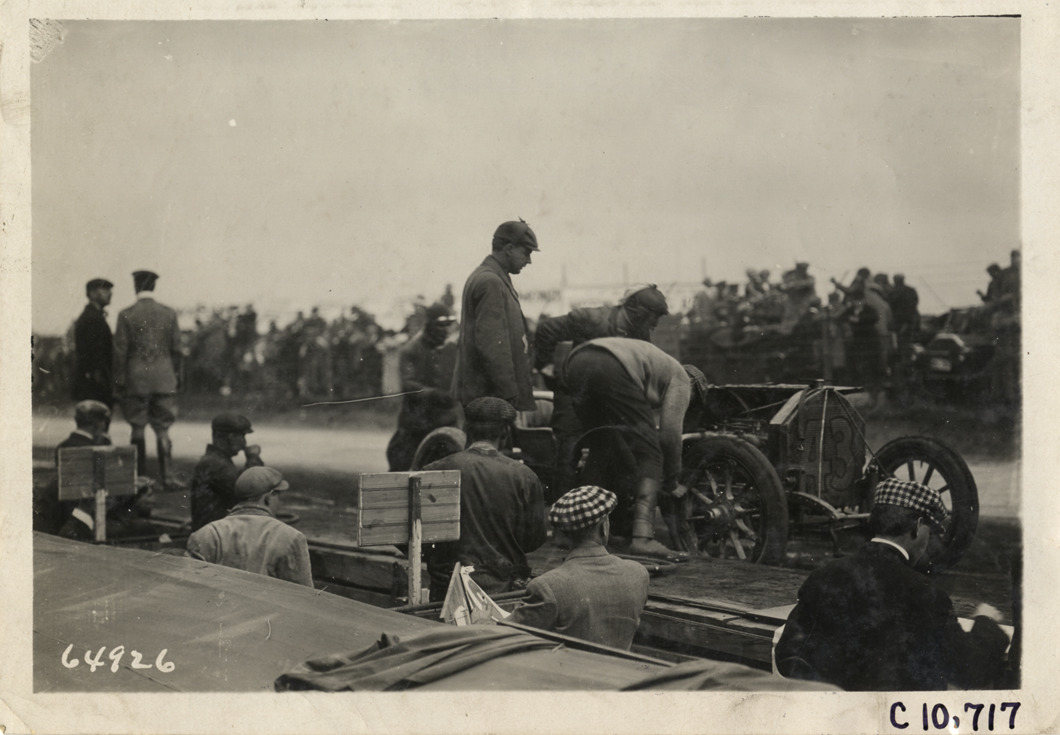 View of three men examining car on sidelines of racetrack during 1911 Federation of American Motorcyclists races in Fort Erie, Ontario. Stamped on back: "Spooner & Wells, Inc., photographers, telephones 3472-3473 Columbus, 1931 Broadway, New York." Handwritten on back: "Motorcycle races--Federation of American Motorcyclists championship races, 1911."