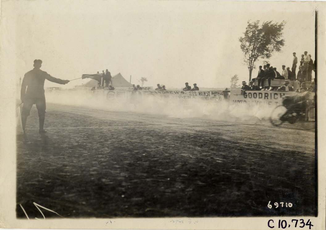 View of motorcyclist crossing finish line in race during 1911 Federation of American Motorcyclists races in Fort Erie, Ontario. Official waves flag at finish line; spectators in background. Stamped on back: "Spooner & Wells, Inc., photographers, telephones 3472-3473 Columbus, 1931 Broadway, New York." Handwritten on back: "Motorcycle races--Federation of American Motorcyclists championship races, 1911."