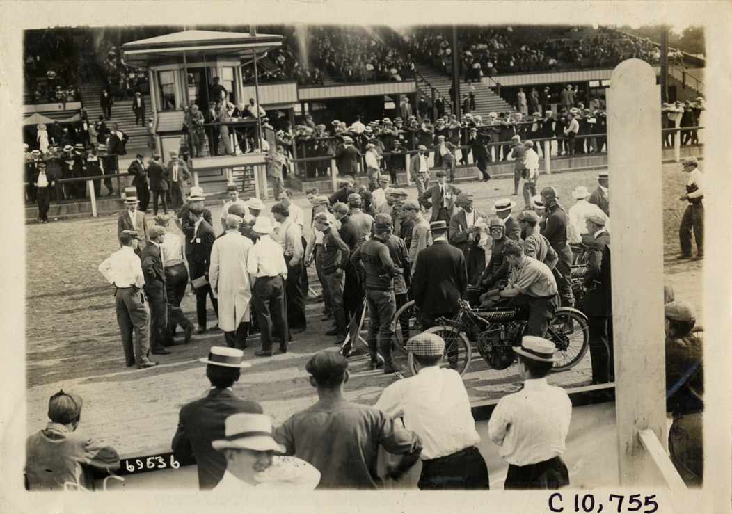 Motorcyclists and officials on racetrack, 1911 Federation of American Motorcyclists races, Fort Erie, Ontario
