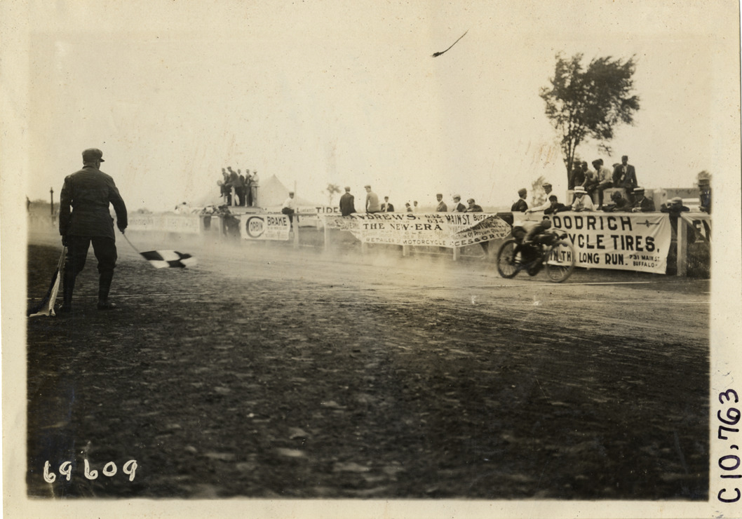 Motorcyclist crossing finish line, 1911 Federation of American Motorcyclists races, Fort Erie, Ontario