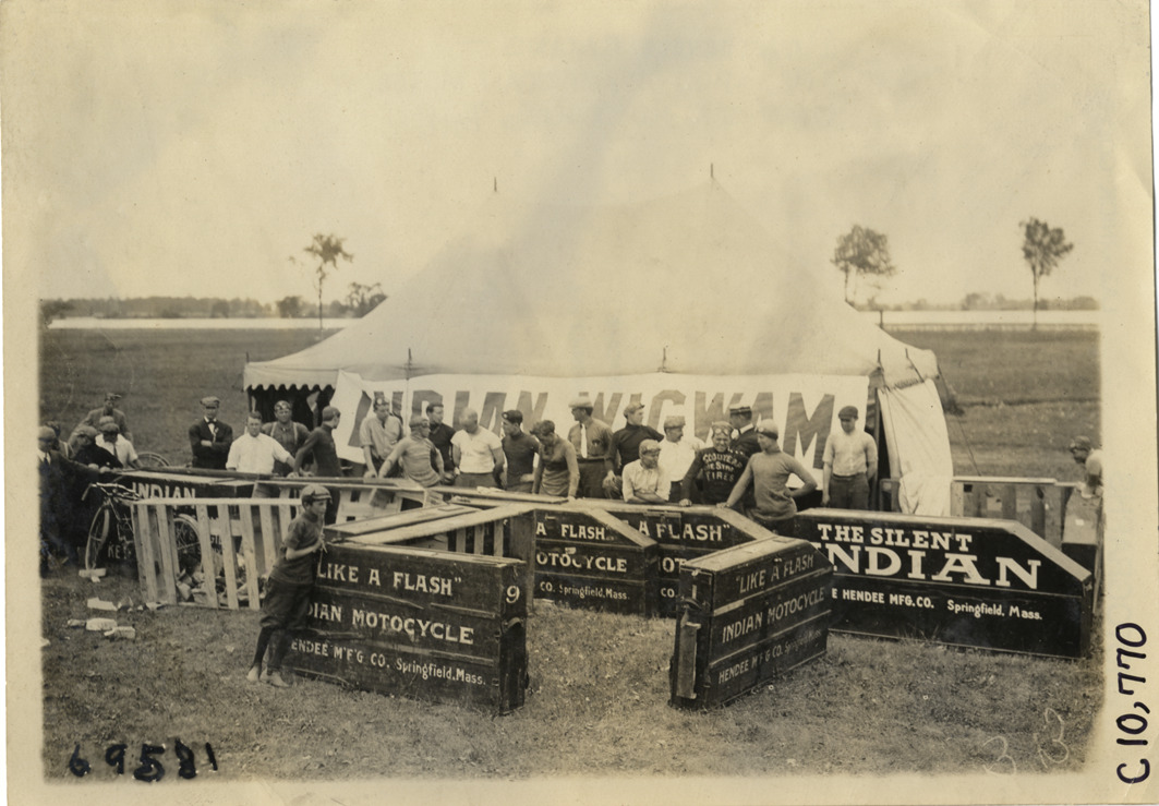 View of group of men standing in front of Indian motorcycle tent during 1911 Federation of American Motorcyclists races in Fort Erie, Ontario. "Indian wigwam" banner hangs on front of tent; several cases labeled with "Like a flash, Indian motorcycle, Hendee Mfg. Co., Springfield, Mass." and "The silent Indian" in foreground. Stamped on back: "Spooner & Wells, Inc., photographers, telephones 3472-3473 Columbus, 1931 Broadway, New York." Handwritten on back: "Motorcycle races--Federation of American Motorcyclists championship races, 1911."