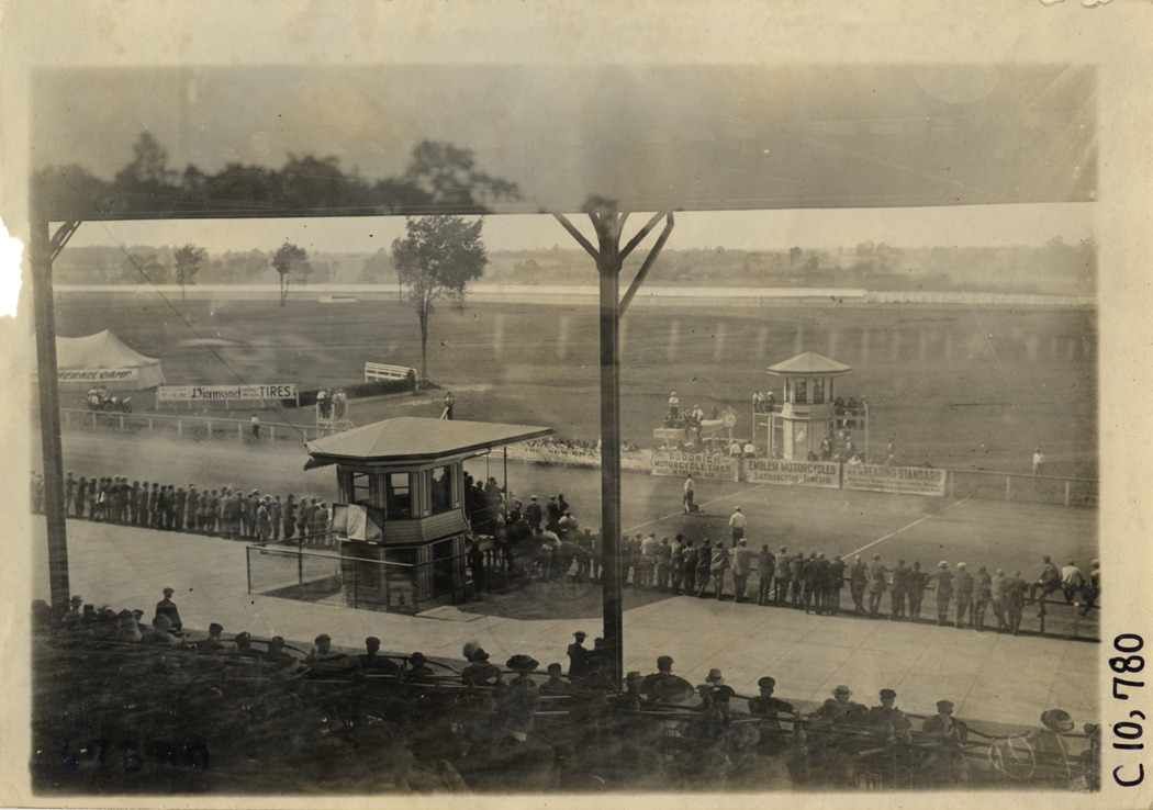 View from grandstand of motorcycle race during 1911 Federation of American Motorcyclists races in Fort Erie, Ontario. Reviewing stands on both sides of racetrack; spectators stand at railing. Banners for Diamond tires, Goodrich motorcycle tires and Emblem motorcycles in background. Stamped on back: "Spooner & Wells, Inc., photographers, telephones 3472-3473 Columbus, 1931 Broadway, New York." Handwritten on back: "Motorcycle races--Federation of American Motorcyclists championship races, 1911."