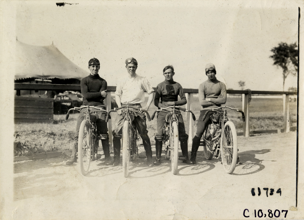 View of motorcyclists Frank Hart, Charles Balka, J.V. Constant and Ed Hasha posing with motorcycles during 1911 Federation of American Motorcyclists races in Fort Erie, Ontario. Stamped on back: "Spooner & Wells, Inc., photographers, telephones 3472-3473 Columbus, 1931 Broadway, New York." Handwritten on back: "Motorcycle races--Federation of American Motorcyclists championship races, 1911. Hart, Balka, Constant, Hasha."