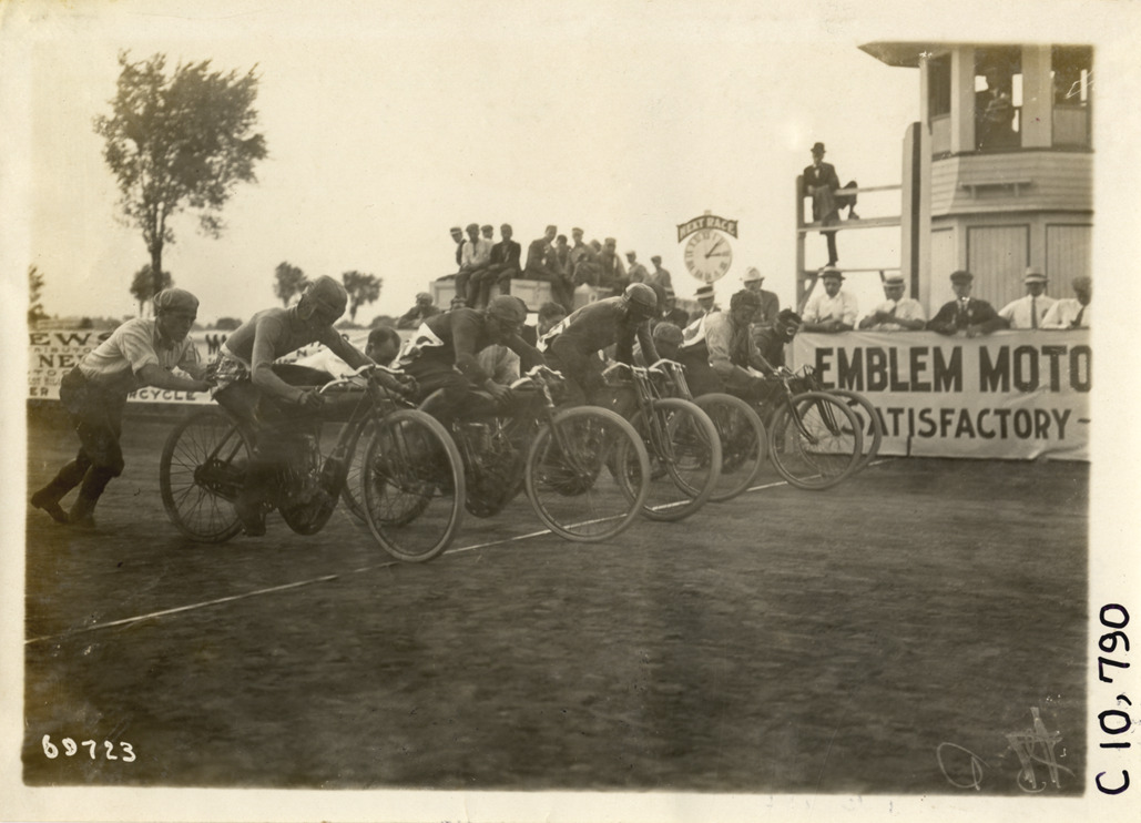 Start of motorcycle race, 1911 Federation of American Motorcyclists races, Fort Erie, Ontario