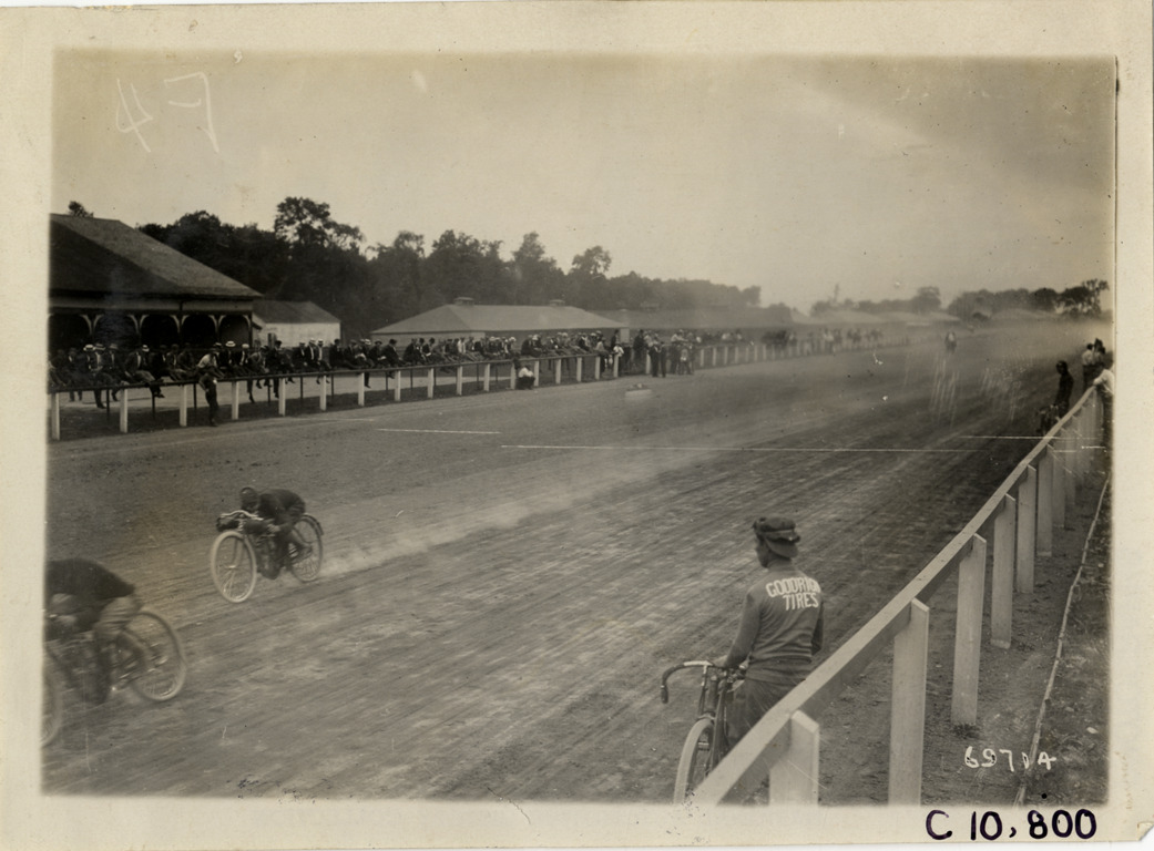 View of spectators watching motorcycle race during 1911 Federation of American Motorcyclists races in Fort Erie, Ontario. Motorcyclist wearing "Goodrich tires" jersey stands with motorcycle alongside railing in foreground. Stamped on back: "Spooner & Wells, Inc., photographers, telephones 3472-3473 Columbus, 1931 Broadway, New York." Handwritten on back: "Motorcycle races--Federation of American Motorcyclists championship races, 1911."