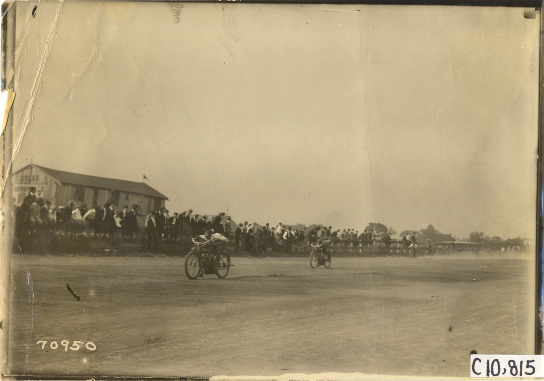 View of spectators watching motorcycle race during 1911 motorcycle races at Guttenberg motordrome in New Jersey. Stamped on back: "Spooner & Wells, Inc., photographers, telephones 3472-3473 Columbus, 1931 Broadway, New York." Handwritten on back: "Motorcycle races--Guttenberg motorcycle races, 1911."