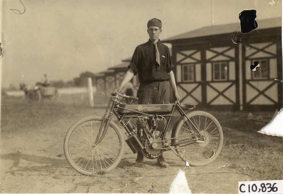 Motorcyclist with Reading Standard motorcycle, 1909 Indianapolis motorcycle races