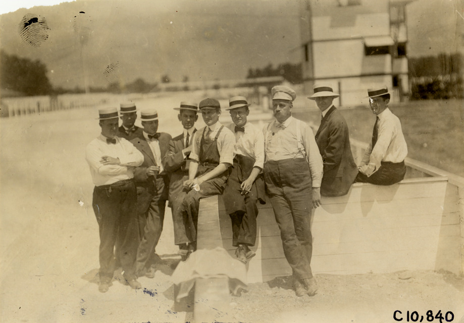 Favorite this☆ Men at racetrack, 1909 Indianapolis motorcycle races Description: Group portrait of unidentified men at racetrack during 1909 motorcycle races in Indianapolis, Indiana. Handwritten on back: "Motorcycle races--Indianapolis motorcycle race, 1909." Details Resource ID: na009797 Subject: Men--Indiana--Indianapolis Motorcycle racing--Indiana--Indianapolis Photographic prints Date Issued: 1909 Format: 1 photographic print ; 4.25 x 6.25 in. Member of: National Automotive History Collection Lazarnick Collection Filing Location: Motorcycle racing--Indianapolis motorcycle race, 1909 Negative Number: Negative #C10,840 Rights: Physical rights are retained by DPL. Copyright is retained in accordance with U.S. copyright laws.