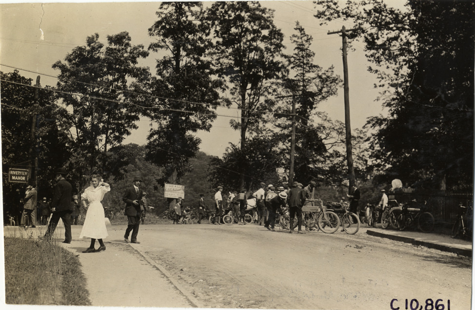 View of motorcyclists waiting near starting line during 1909 New York Motorcycle Club spring run through Brooklyn and Long Island, New York. Woman wearing white dress stands on sidewalk in foreground; "Riverview Manor" sign in background. Stamped on back: "Spooner & Wells, Inc., photographers, telephones 3472-3473 Columbus, 1931 Broadway, New York." Handwritten on back: "Motorcycle races--New York Motorcycle Club spring run, 1909. Starting line."