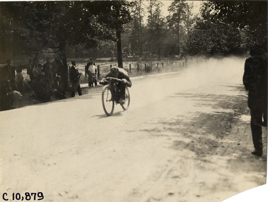 View of Arthur J. Chapple racing motorcycle on rural road during 1909 New York Motorcycle Club spring run through Brooklyn and Long Island, New York. Stamped on back: "Spooner & Wells, Inc., photographers, telephones 3472-3473 Columbus, 1931 Broadway, New York." Handwritten on back: "Motorcycle races--New York Motorcycle Club spring run, 1909. Chappell [sic]."