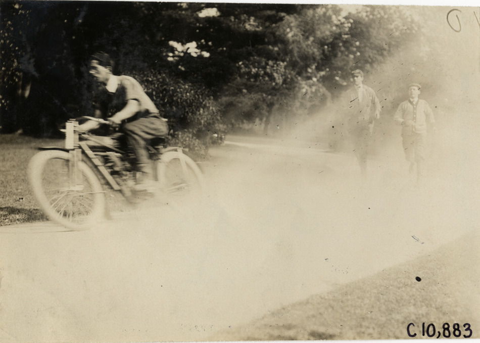 View of Swain racing Reading Standard motorcycle on rural road during 1909 New York Motorcycle Club spring run through Brooklyn and Long Island, New York. Two men run behind motorcycle. Stamped on back: "Spooner & Wells, Inc., photographers, telephones 3472-3473 Columbus, 1931 Broadway, New York." Handwritten on back: "Motorcycle races--New York Motorcycle Club spring run, 1909. Swayne [sic] on R.S."