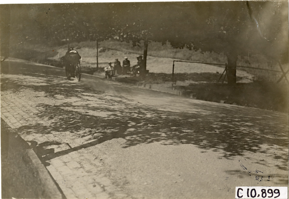View of man racing motorcycle on rural road during 1909 New York Motorcycle Club spring run through Brooklyn and Long Island, New York. Spectators on roadside. Stamped on back: "Spooner & Wells, Inc., photographers, telephones 3472-3473 Columbus, 1931 Broadway, New York." Handwritten on back: "Motorcycle races--New York Motorcycle Club spring run, 1909."