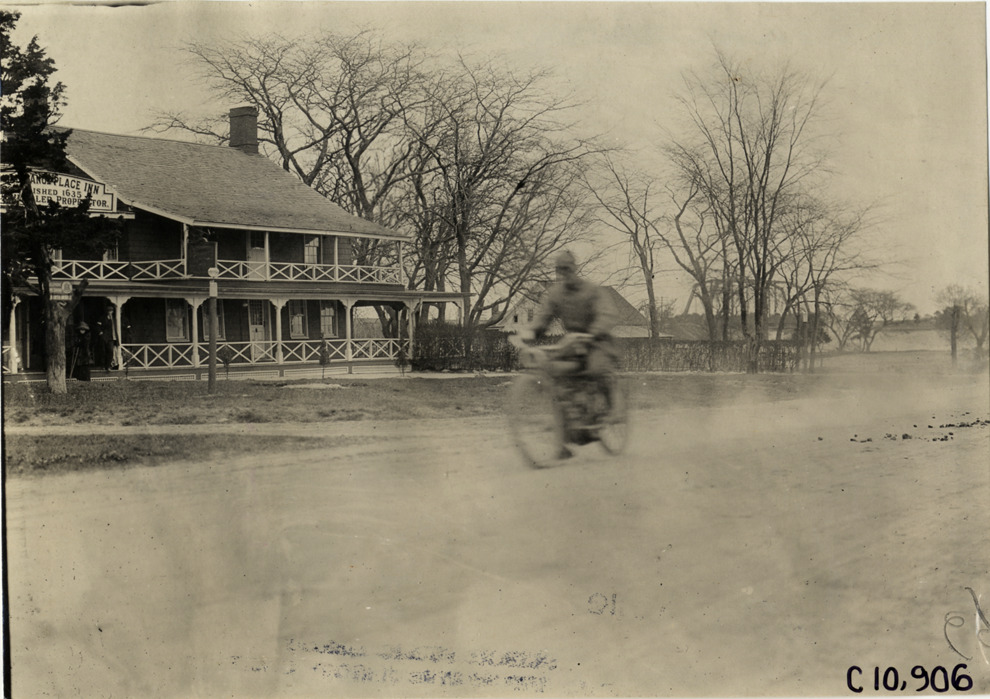Motorcyclist traveling past Canoe Place Inn, 1909 New York Motorcycle Club spring run