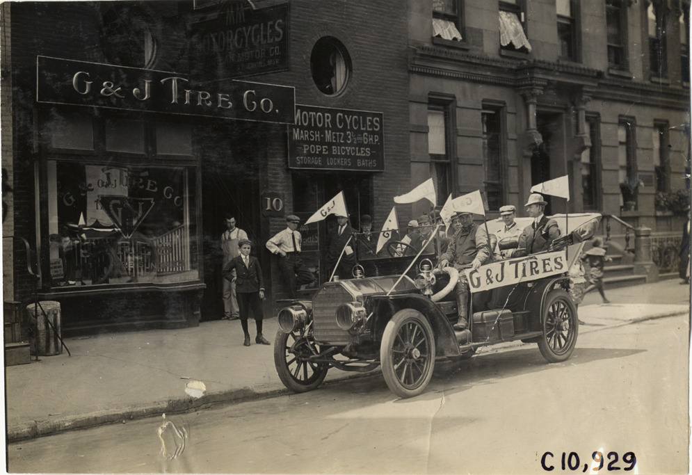 View of motorists in G & J Tires roadside assistance car during 1909 New York Motorcycle Club spring run through Brooklyn and Long Island, New York. Car, decorated with "G & J Tires" banner and flags, is parked in front of G & J Tires Company store. Sign on building: "Motor cycles, Marsh, Metz, 3 1/2 and 6 h.p., Pope bicycles, storage, lockers, baths." Stamped on back: "Spooner & Wells, Inc., photographers, telephones 3472-3473 Columbus, 1931 Broadway, New York." Handwritten on back: "Motorcycle races--New York Motorcycle Club spring run, 1909. G & J Tire car, NYMC meet, Hastings."