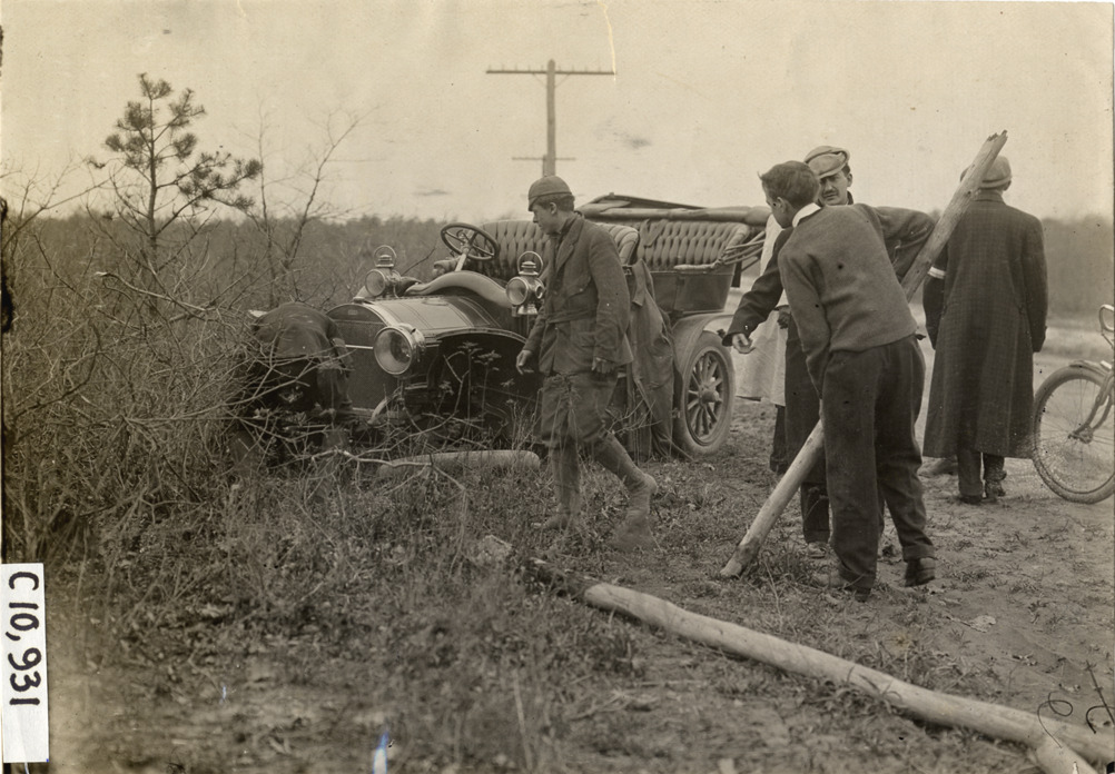 View of man examining front end of Morgan & Wright tires roadside assistance car stopped in underbrush during 1909 New York Motorcycle Club spring run through Brooklyn and Long Island, New York. Two men stand with broken wooden pole; another section of pole on ground in foreground. Stamped on back: "Spooner & Wells, Inc., photographers, telephones 3472-3473 Columbus, 1931 Broadway, New York." Handwritten on back: "Motorcycle races--New York Motorcycle Club spring run, 1909."