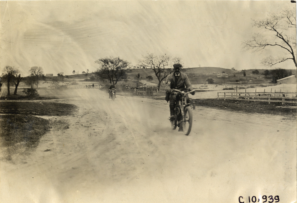View of two motorcyclists traveling on rural road during 1909 New York Motorcycle Club spring run through Brooklyn and Long Island, New York. Stamped on back: "Spooner & Wells, Inc., photographers, telephones 3472-3473 Columbus, 1931 Broadway, New York." Handwritten on back: "Motorcycle races--New York Motorcycle Club spring run, 1909."