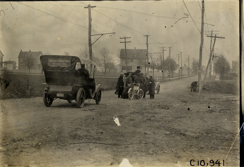 View of motorists from G & J Tires roadside assistance car furnishing tire patch for motorcyclist P. Guthrie during 1909 New York Motorcycle Club spring run through Brooklyn and Long Island, New York. Morgan & Wright emergency assistance car in foreground. "Morgan & Wright tires are good tires" sign on rear of car. Stamped on back: "Spooner & Wells, Inc., photographers, telephones 3472-3473 Columbus, 1931 Broadway, New York." Handwritten on back: "Motorcycle races--New York Motorcycle Club spring run, 1909. G & J emergency car furnishing a blowout patch to Mr. Guthrie on a NSU near Jamaica, L.I."