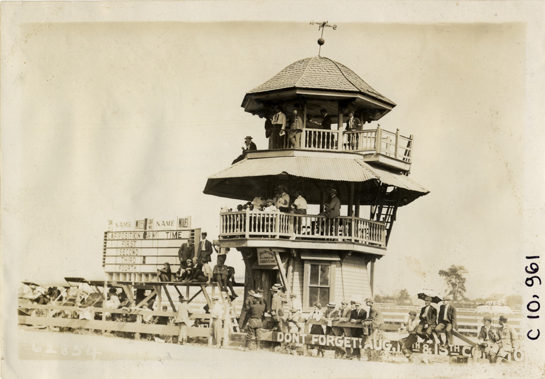 View of judge's stand, racing officials and scoreboard at 1910 motorcycle races at Point Breeze racetrack in Philadelphia, Pennsylvania. Sign on front of building: "Only officials allowed in judge's stand." Stamped on back: "Spooner & Wells, Inc., photographers, telephones 3472-3473 Columbus, 1931 Broadway, New York." Handwritten on back: "Motorcycle races--Point Breeze motorcycle races, 1910."