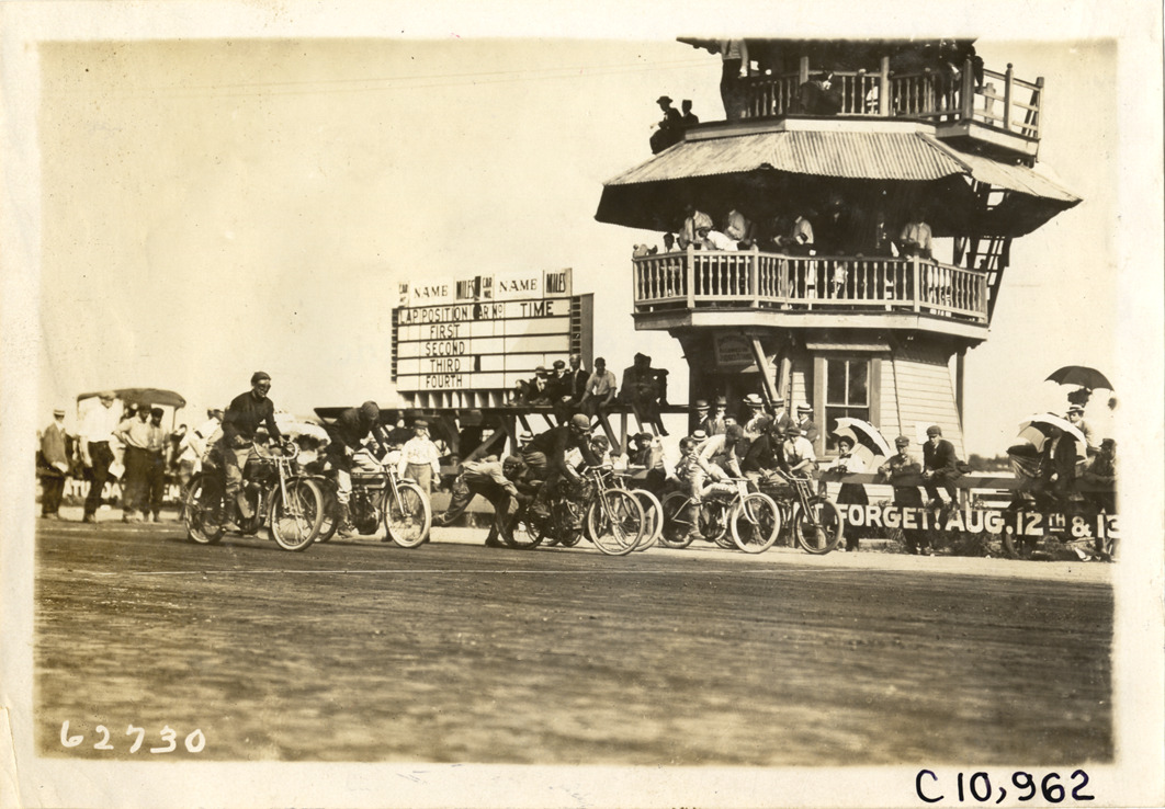 Start of motorcycle race, 1910 Point Breeze motorcycle races