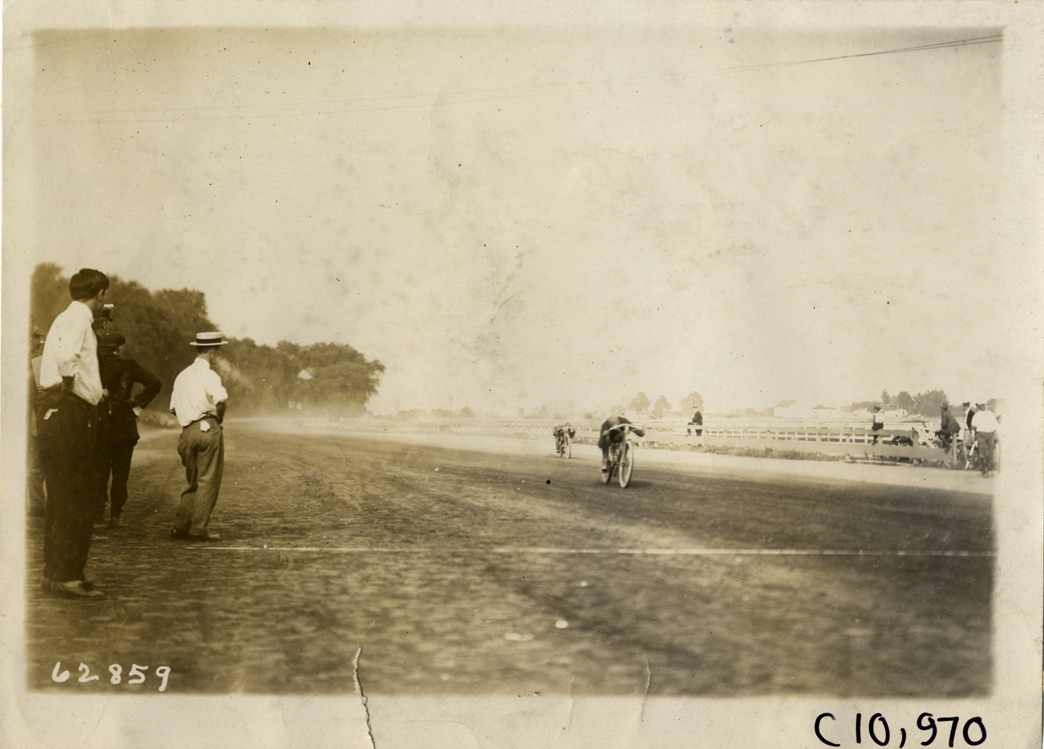 Motorcyclists approaching finish line, 1910 Point Breeze motorcycle races