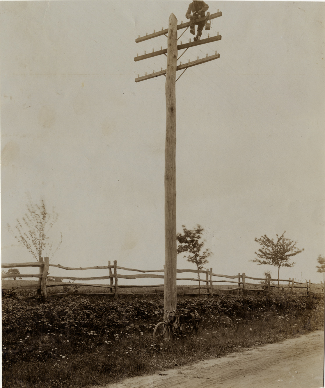 Favorite this☆ Man making repairs at top of utility pole Description: View of man making repairs at top of utility pole; motorcycle with rolls of wire at base of pole. Handwritten on back: "Motorcycles--Unidentified, 1906." Details Resource ID: na009926 Subject: Motorcycles Electric lines--Poles and towers--Maintenance and repair Photographic prints Date Issued: 1906 Format: 1 photographic print ; 9 x 7.5 in. Member of: National Automotive History Collection Lazarnick Collection Filing Location: Motorcycles Rights: Physical rights are retained by DPL. Copyright is retained in accordance with U.S. copyright laws.