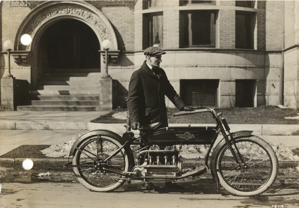 View of motorcyclist posing with Henderson motorcycle. Steps and arched entrance of brick building in background. Stamped on back: "Spooner & Wells, Inc., photographers, 1231 Woodward Ave., Detroit, Mich." Handwritten on back: "Motorcycles--Henderson. Henderson motorcycle on road."