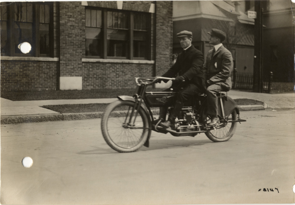 Favorite this☆ Two men riding Henderson motorcycle Description: View of two men riding Henderson motorcycle. Handwritten on back: "Motorcycles--Henderson. Taken for Henderson Motorcycle Co." Details Resource ID: na009958 Subject: Henderson motorcycle Motorcyclists Photographic prints Date Issued: Unknown year Format: 1 photographic print ; 4.5 x 6.5 in. Member of: National Automotive History Collection Lazarnick Collection Filing Location: Motorcycles--Henderson Rights: Physical rights are retained by DPL. Copyright is retained in accordance with U.S. copyright laws.