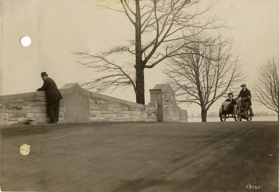 View of couple in Henderson motorcycle crossing stone bridge on Belle Isle. Man leans over bridge in foreground. Stamped on back: "Spooner & Wells, Inc., photographers, 1231 Woodward Ave., Detroit, Mich." Handwritten on back: "Motorcycles--Henderson. Henderson motorcycles at Belle Isle."