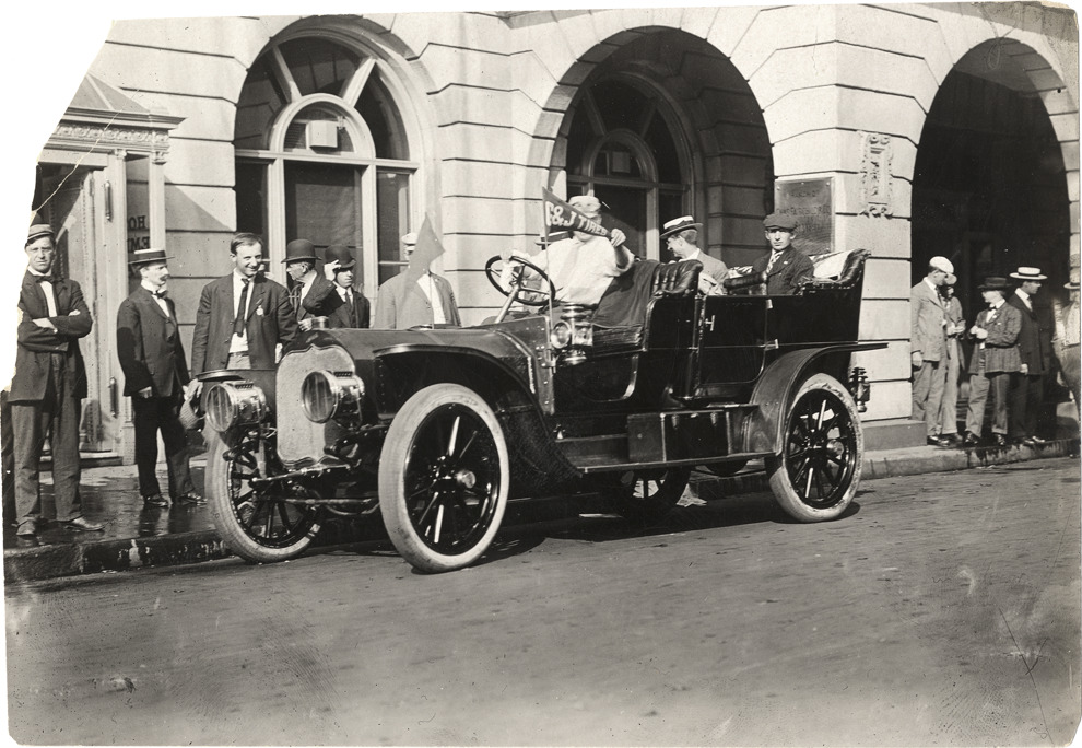 Favorite this☆ Motorists in 1908 National automobile Description: View of motorists in 1908 National car, parked in front of Chas. Fairchild & Co. building. "G & J Tires" pennant on car; onlookers stand on sidewalk. Handwritten on back: "National, 1908." Details Resource ID: na009986 Subject: Automobiles National Motor Vehicle Company Photographic prints Date Issued: Unknown year Format: 1 photographic print ; 4.5 x 6.75 in. Member of: National Automotive History Collection Lazarnick Collection Filing Location: National Rights: Physical rights are retained by DPL. Copyright is retained in accordance with U.S. copyright laws.