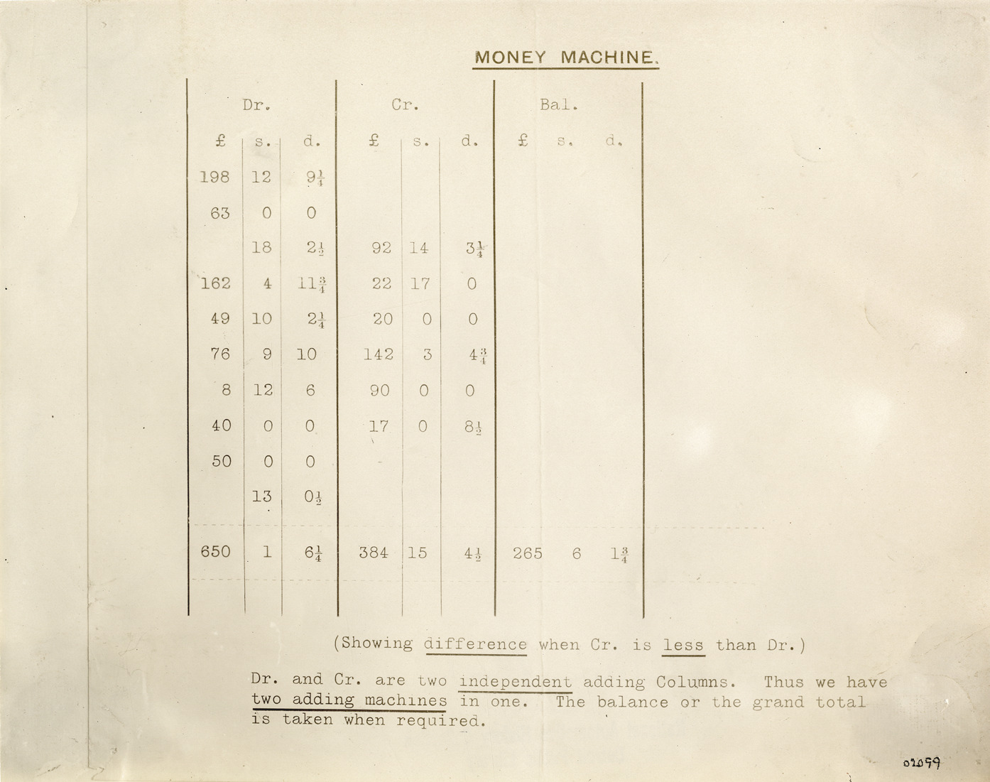 View of chart showing sample Burroughs Adding Machine Company adding machine balance sheet. Printed on front: "Money machine. (Showing difference when Cr. is less than Dr.) Cr. and Dr. are two independent adding columns. Thus we have two adding machines in one. The balance or the grand total is taken when required." Handwritten on back: "Office equipment, 1911. Burroughs Adding Machine Co."
