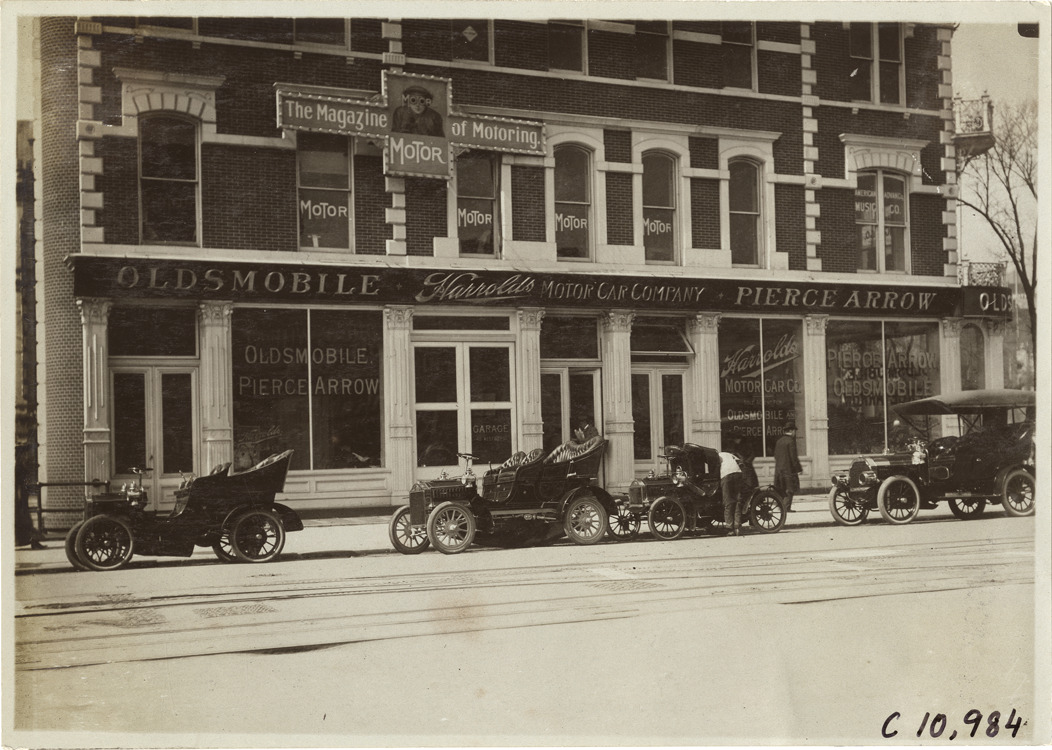 View of several 1905 Oldsmobile cars, parked in front of Harrold's Motor Car Company. "Harrold's Motor Car, Oldsmobile, Pierce Arrow" and "Motor, the magazine of motoring" signs on building. Handwritten on back: "Oldsmobile, 1905."