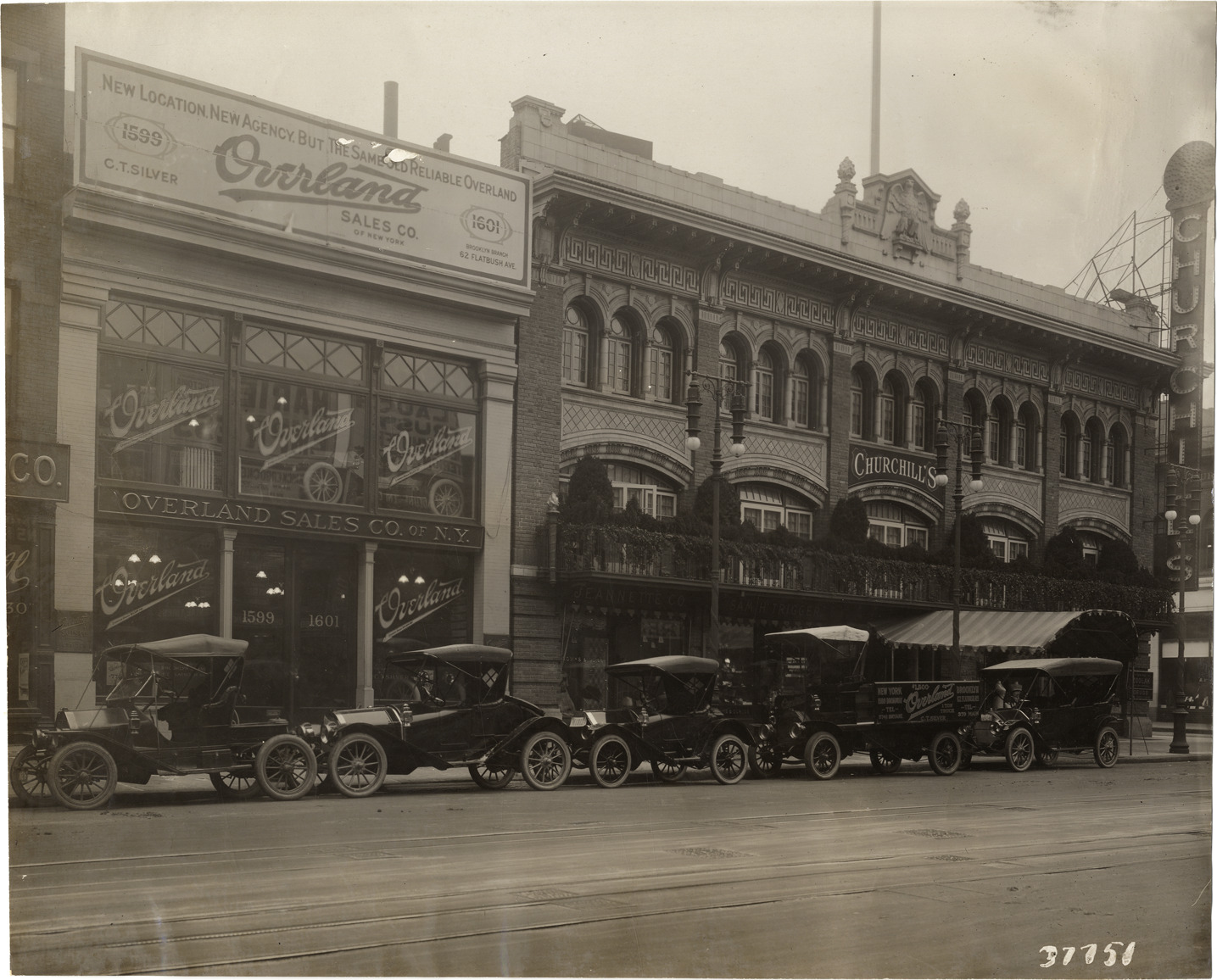 View of 1910 Overland cars and truck parked in front of Overland Sales Company of N.Y. and Churchill's stores. Billboard on roof reads: "Overland Sales Co. of New York, new location, new agency, but the same old reliable Overland, C.T. Silver, Brooklyn Branch, 62 Flatbush Ave." Stamped on back: "Spooner & Wells, Inc., photographers, telephones 3472-3473 Columbus, 1931 Broadway, New York." Handwritten on back: "Overland, 1910."