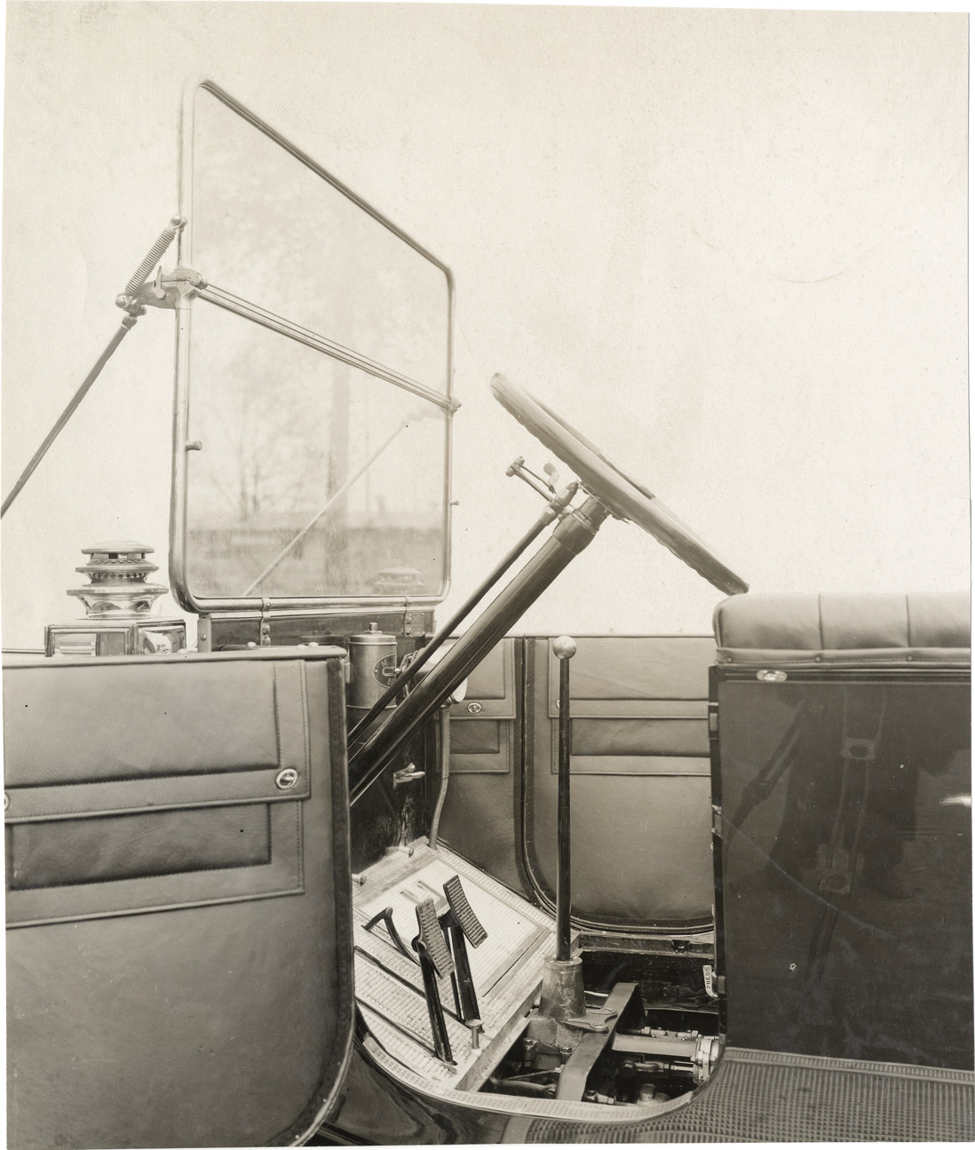 Steering column, floorboard and windshield, 1910 Owen automobile