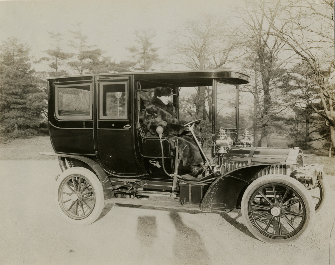 View man, wearing fur coat, in 1906 Packard car. Stamped on back: "Photo by F. Ed. Spooner, 1536 B'way, telephone 6536-38th St., New York, N.Y." Handwritten on back: "Packard, 1906."