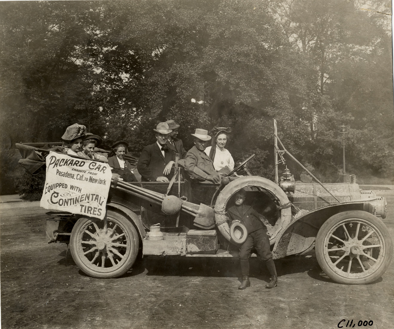 View of J.M. Murdock family posing in 1908 Packard car; young boy leans against spare tire. Sign on car: "Packard car enroute from Pasadena, Cal. to New York, equipped with Continental tires." The Murdocks of Johnston, Pennsylvania, were the first family to make a California to New York automobile trip. Handwritten on back: "Packard, 1908."