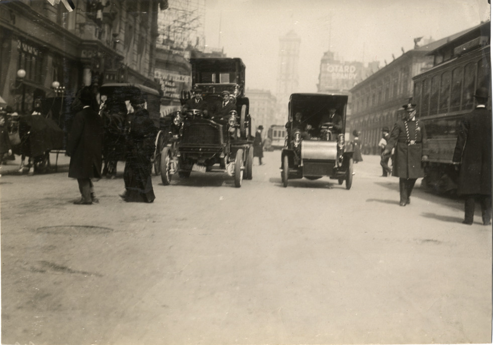 Favorite this☆ Driver and passenger in 1908 Packard truck Description: View of driver and passenger in 1908 Packard truck, traveling between car and horse-drawn carriage on busy street. Truck transports an automobile; policeman stands next to streetcar on right. Handwritten on back: "Packard, 1908." Details Resource ID: na010049 Subject: Trucks Automobiles Packard Motor Car Company Automobiles--Transportation Photographic prints Date Issued: Unknown year Format: 1 photographic print ; 4.5 x 6.5 in. Member of: National Automotive History Collection Lazarnick Collection Filing Location: Packard #1 Rights: Physical rights are retained by DPL. Copyright is retained in accordance with U.S. copyright laws.