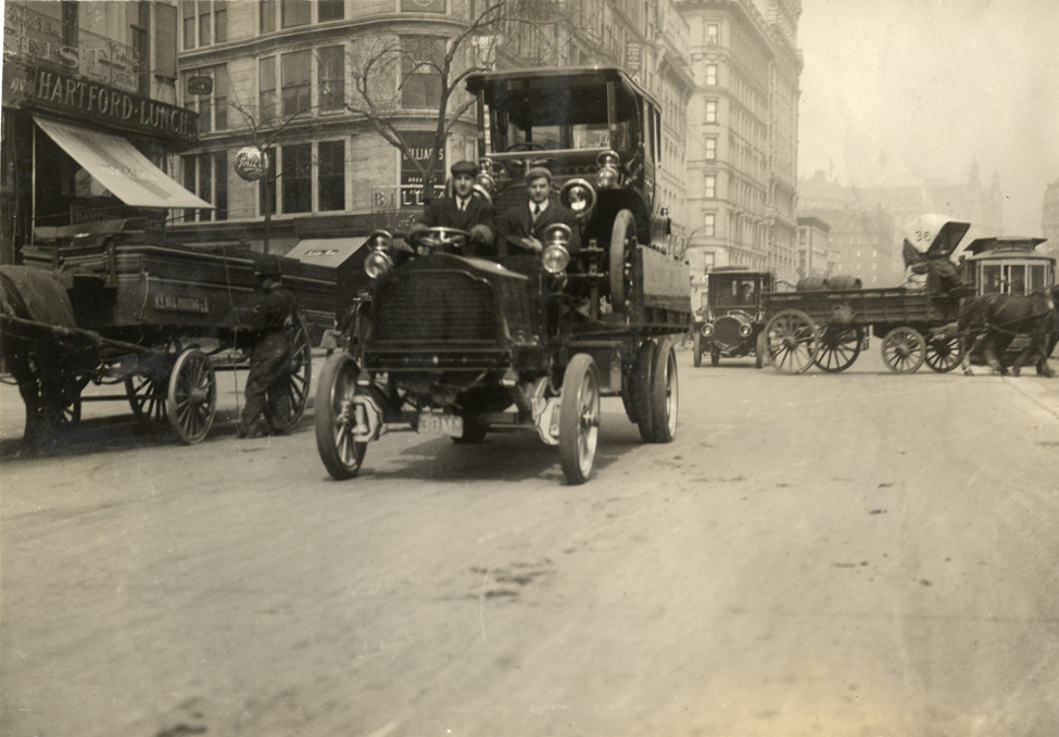 Favorite this☆ Driver and passenger in 1908 Packard truck Description: View of driver and passenger in 1908 Packard truck, transporting a car. Horse-drawn wagons, automobile and streetcar in background. Handwritten on back: "Packard, 1908." Details Resource ID: na010051 Subject: Trucks Horse-drawn vehicles Packard Motor Car Company Automobiles--Transportation Photographic prints Date Issued: Unknown year Format: 1 photographic print ; 4.5 x 6.5 in. Member of: National Automotive History Collection Lazarnick Collection Filing Location: Packard #1 Rights: Physical rights are retained by DPL. Copyright is retained in accordance with U.S. copyright laws.