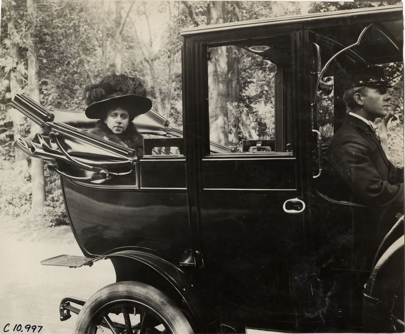 Close-up view of woman riding in rear seat of 1908 Packard car, being driven by chauffeur. Stamped on back: "Spooner & Wells, Inc., photographers, telephones 3472-3473 Columbus, 1931 Broadway, New York." Handwritten on back: "Packard, 1908."