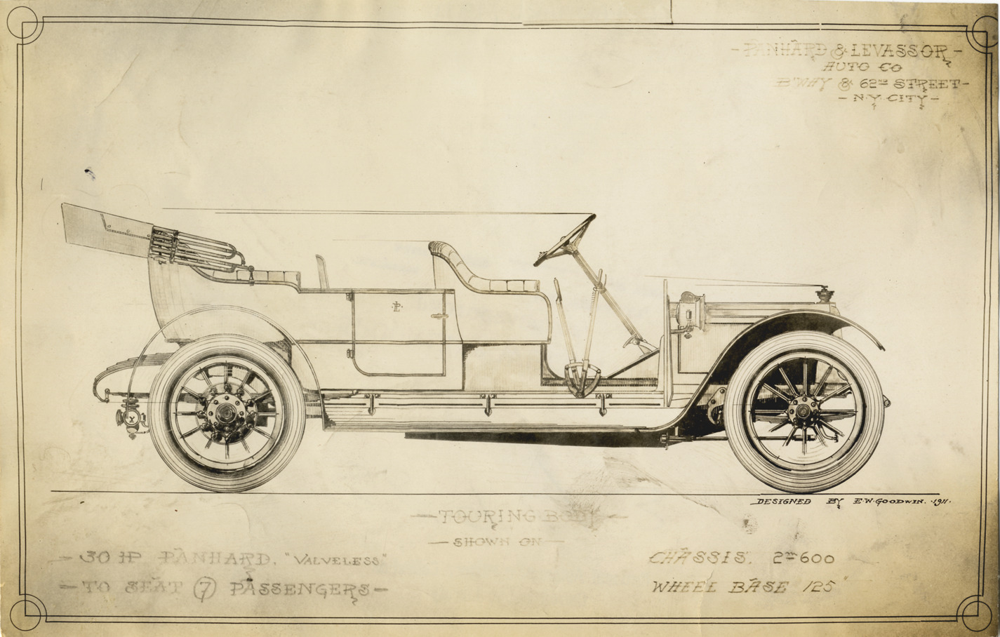 Drawing of 1911 Panhard car. Printed on front: "Panhard & Levassor Auto Co., B'way & 62nd Street, N.Y. City. Touring body shown on 30 hp Panhard 'valveless', to seat 7 passengers, chassis 2-600, wheel base 125. Designed by E.W. Goodwin, 1911." Stamped on back: "Spooner & Wells, Inc., photographers, telephones 3472-3473 Columbus, 1931 Broadway, New York." Handwritten on back: "Panhard, 1911."