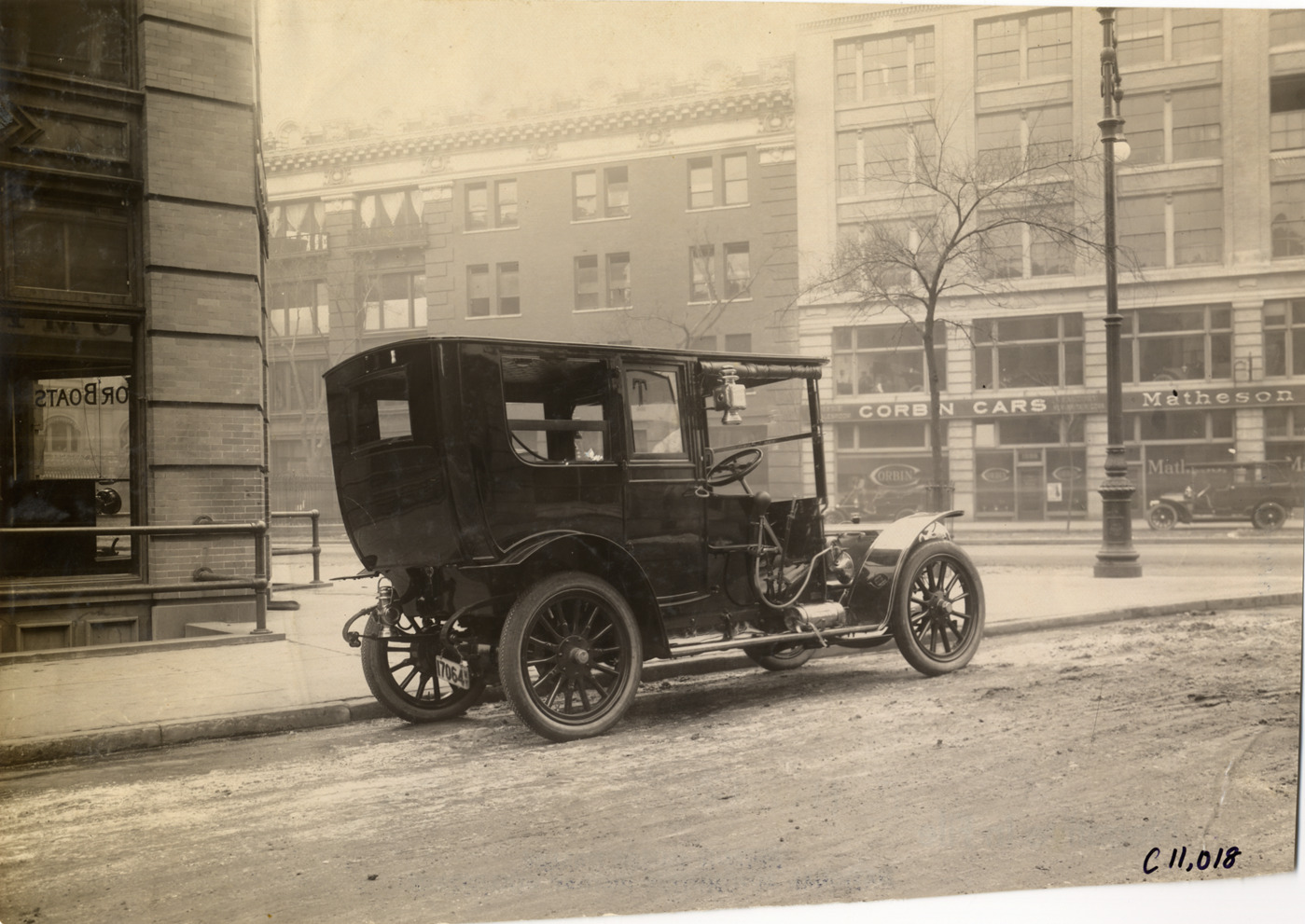 View of 1909 Panhard car. Commercial buildings in background. Handwritten on back: "Panhard, 1909."