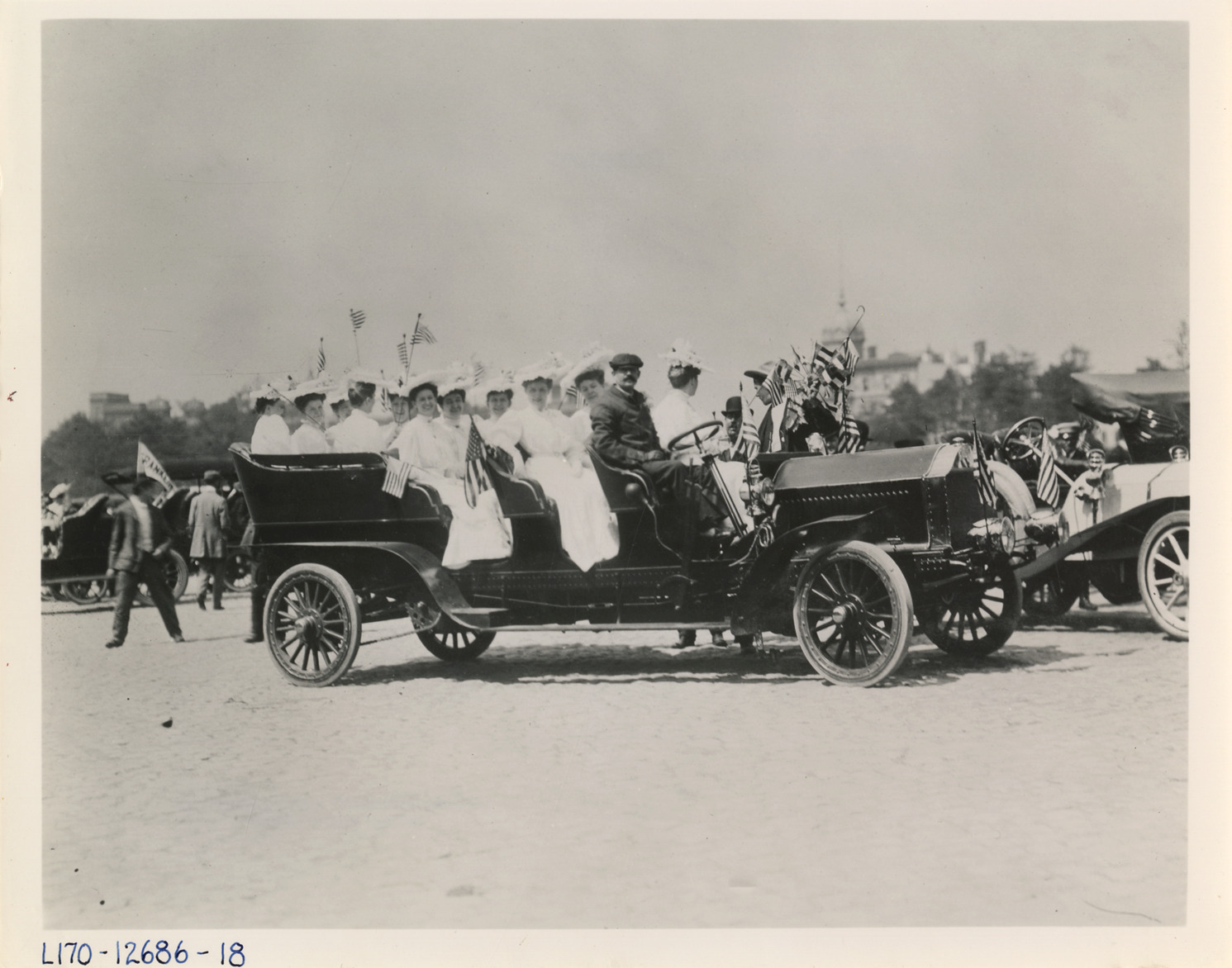View of group of women, wearing white dresses and hats and holding small American flags, riding in car for parade. Handwritten on back: "Parades."