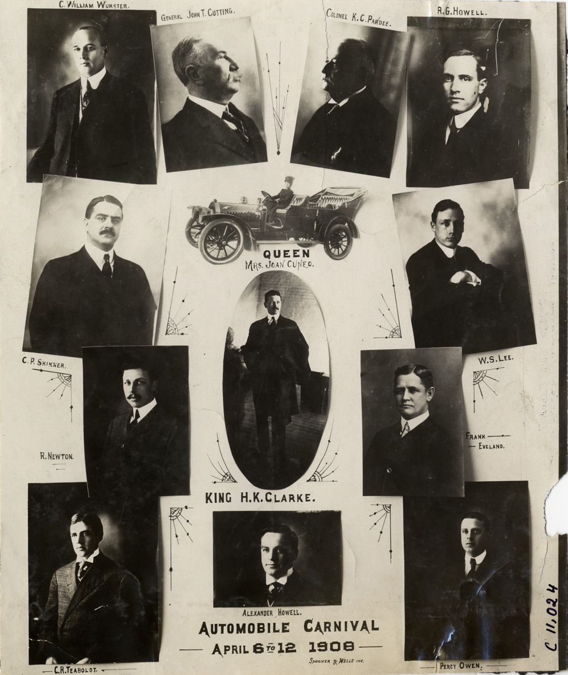 Collage of portraits of participants in 1908 automobile carnival in New York City. Printed on front: "Automobile carnival, April 6 to 12, 1908. C. William Wurster; General John T. Cutting; Colonel K.C. Pardee; R.G. Howell; C.P. Skinner; Queen, Mrs. Joan Cuneo; King, H.K. Clark; W.S. Lee; Frank Eveland; C.R. Teaboldt; Alexander Howell; Percy Owen. Spooner & Wells, Inc." Handwritten on back: "Parades--Automobile Carnival, 1908."