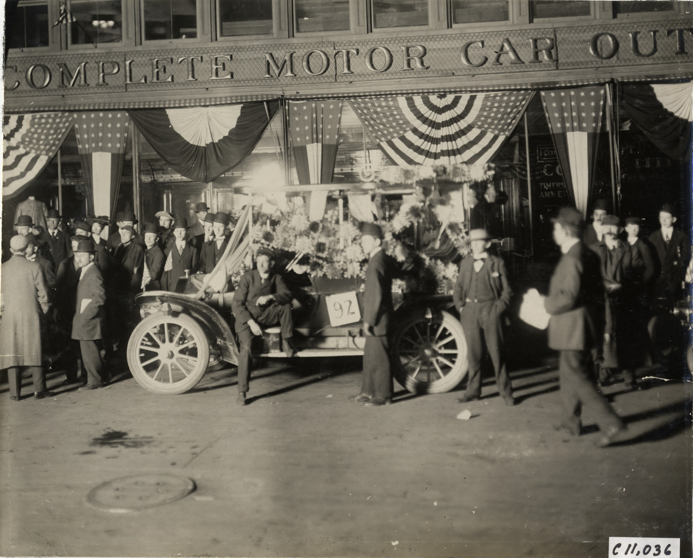 Nighttime view of three men standing with Oldsmobile car decorated with floral garlands for 1908 automobile carnival in New York City. Onlookers stand on sidewalk; building in background is decorated with bunting. Handwritten on back: "Parades--Automobile Carnival, 1908. Oldsmobile."